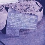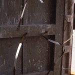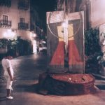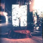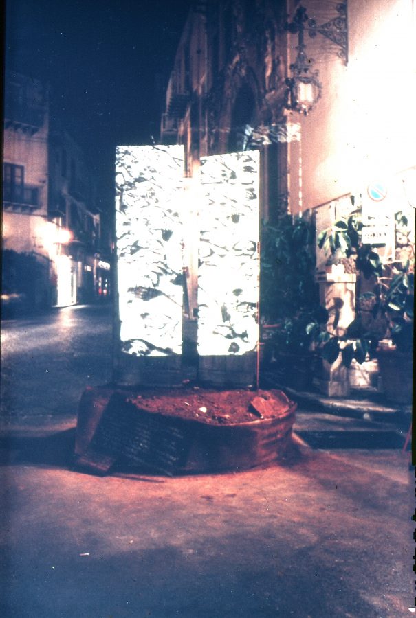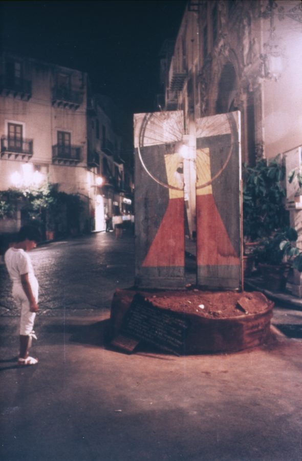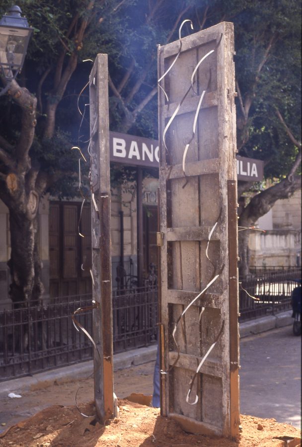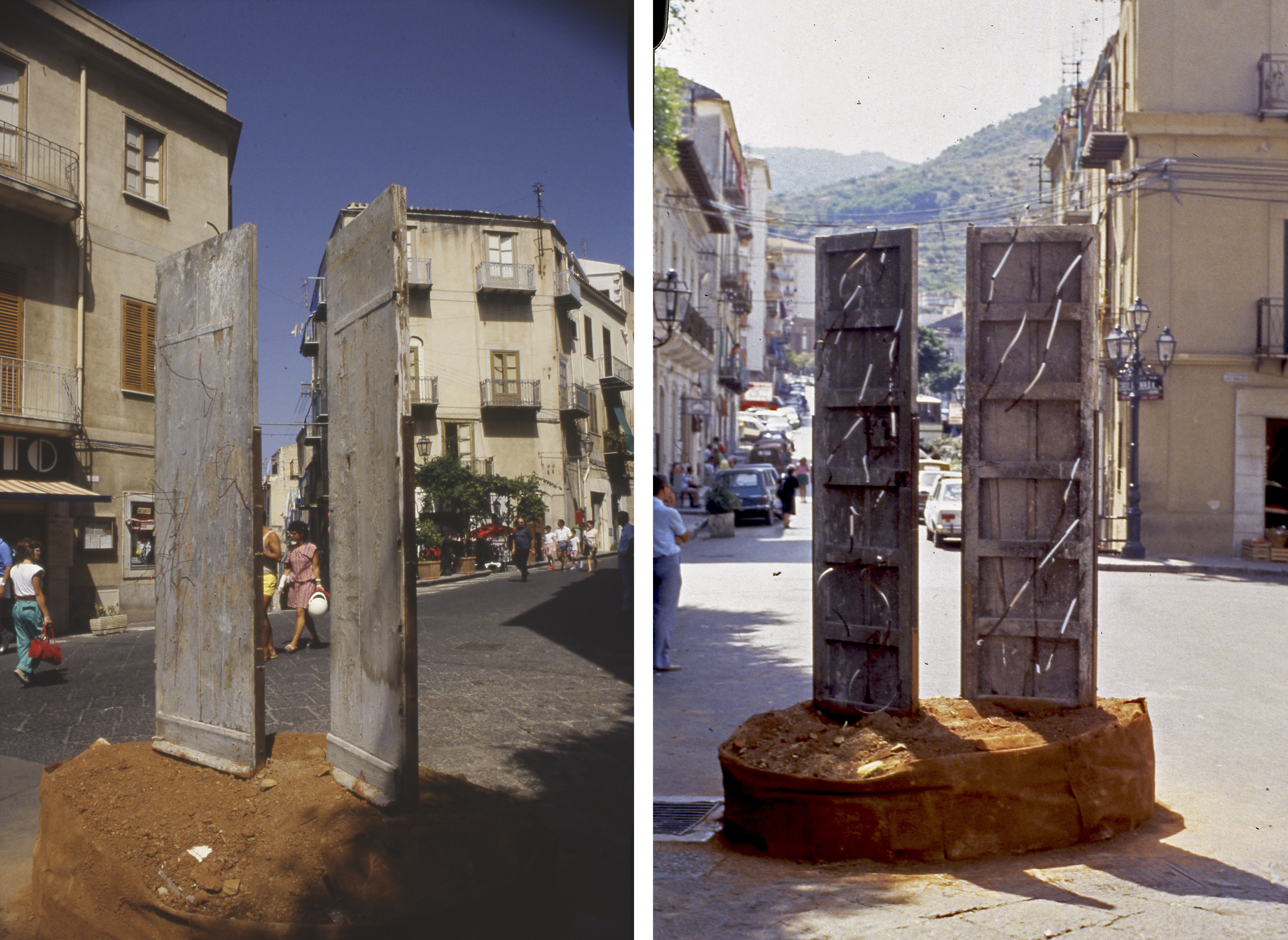 Due elementi verticali si innalzano su una base quadrata, definendo un varco che si impone nello spazio pubblico. Legno, terra, iuta, lamiere e ferro costruiscono una materia stratificata e segnata, attraversata da immagini proiettate che introducono una dimensione temporale instabile. Collocata al centro della piazza, l’opera non si attraversa ma si aggira: il movimento circolare dello spettatore attiva una relazione continua tra corpo, materia e spazio, trasformando la soglia in dispositivo percettivo.