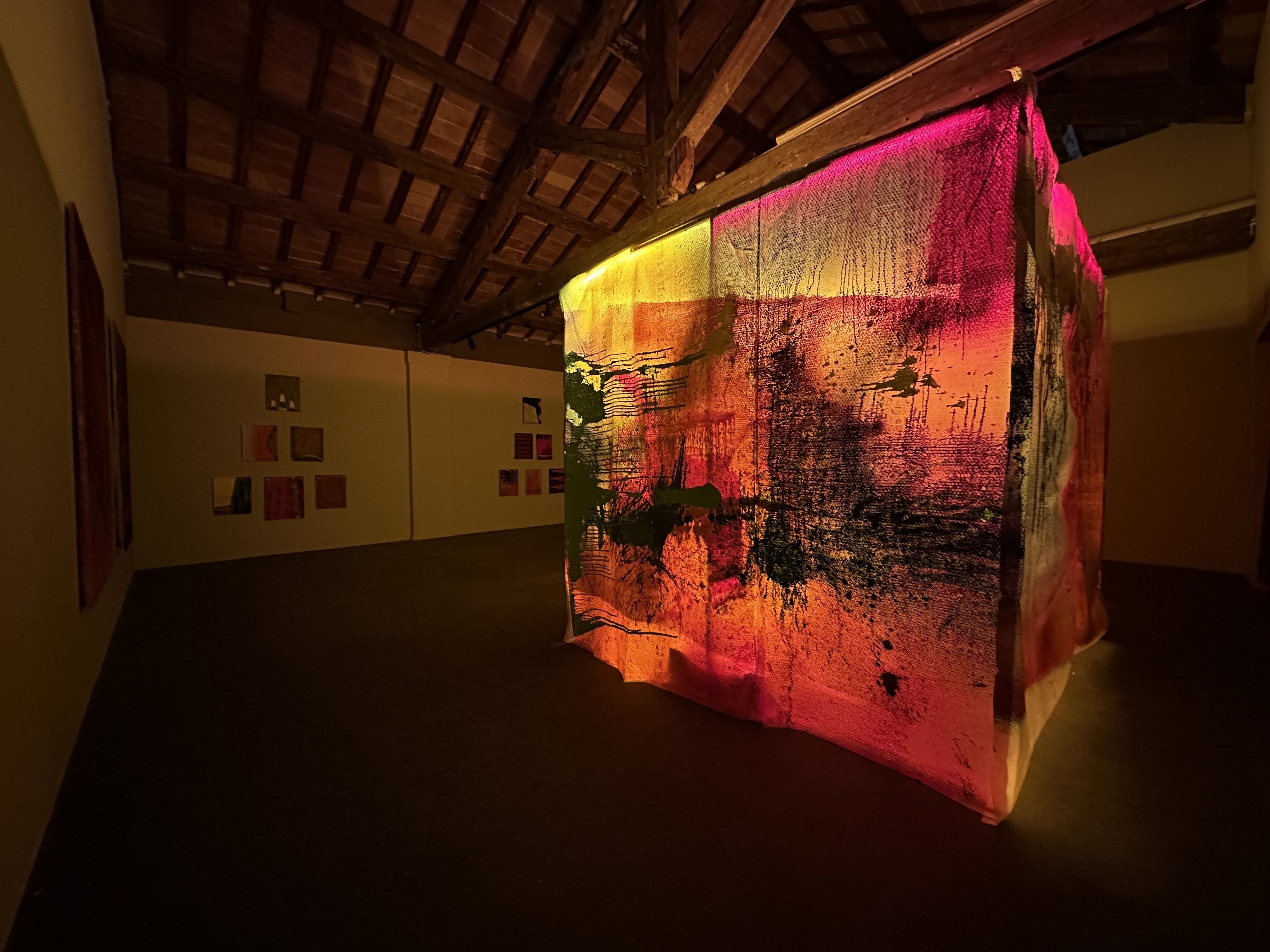 acrilico su pluriball, tubi di metallo, luci a led e video proiezione.