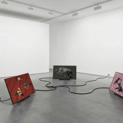 Globo terrestre su cestino spazzatura, rifiuti vari, 70 teschi di vari colori, movibili e ricollocabili.