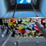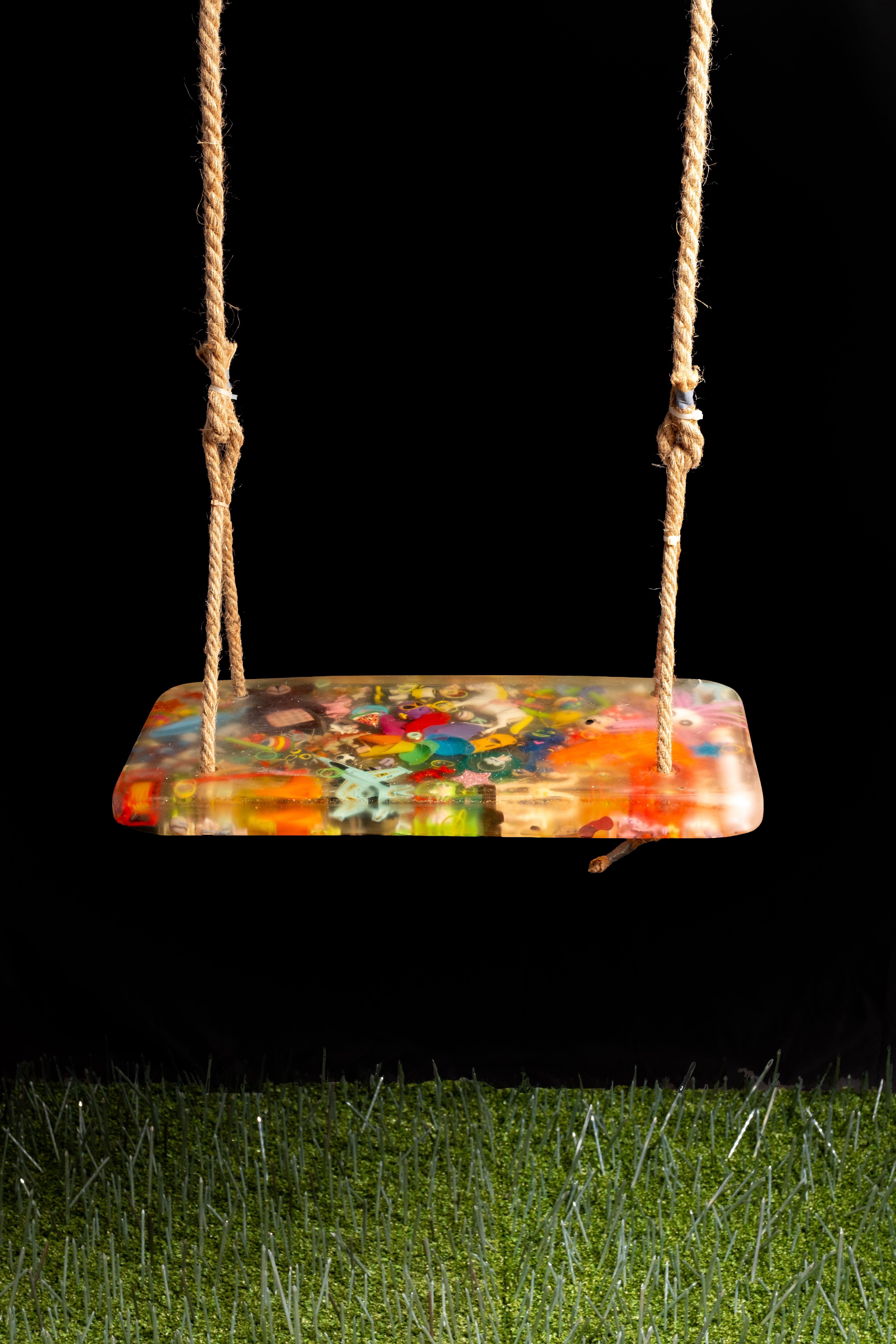 Tecnica mista, materiali: chiodi, erba sintetica, corda, resina, plastica, legno, plexiglass, led