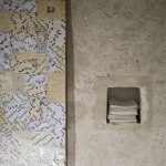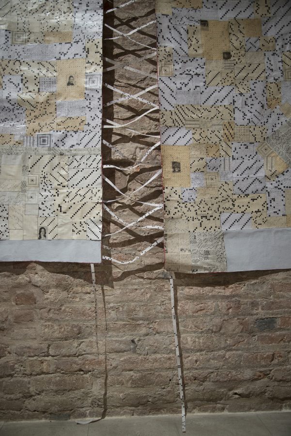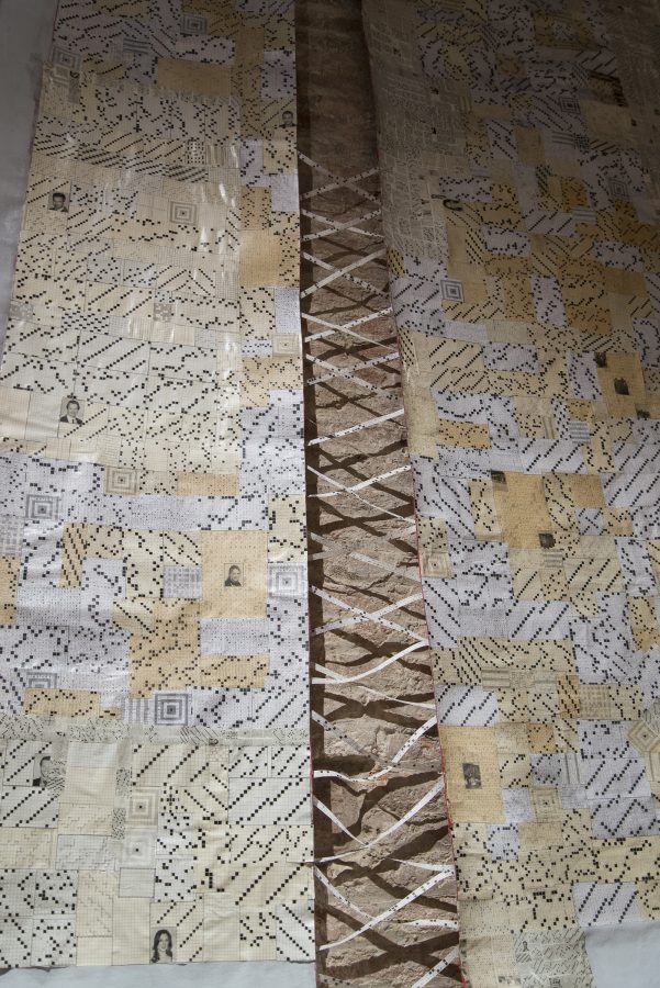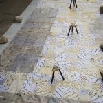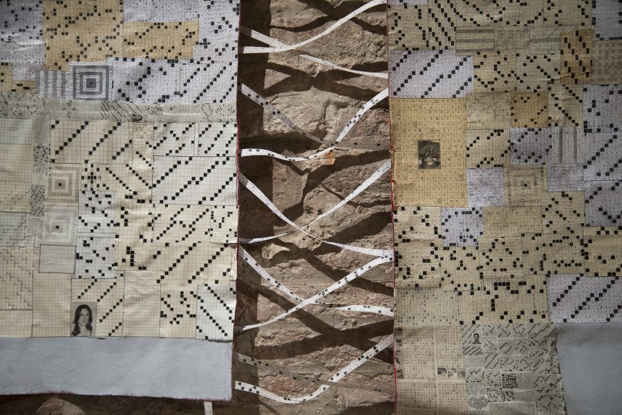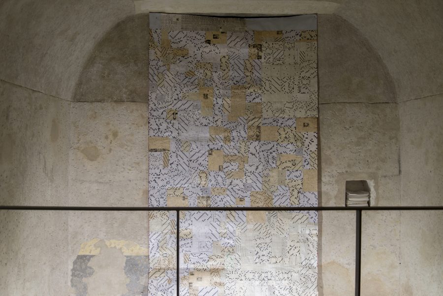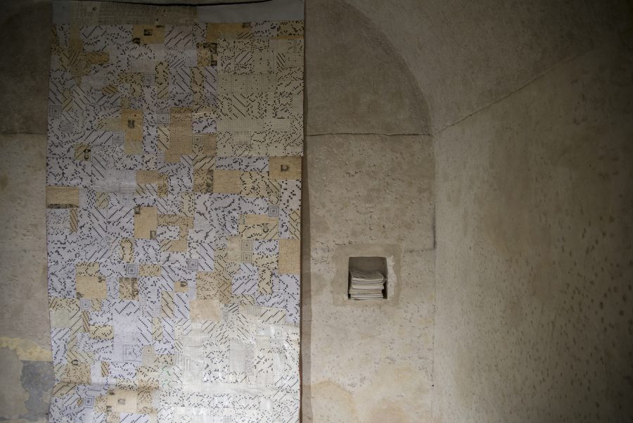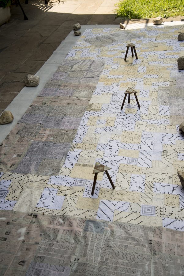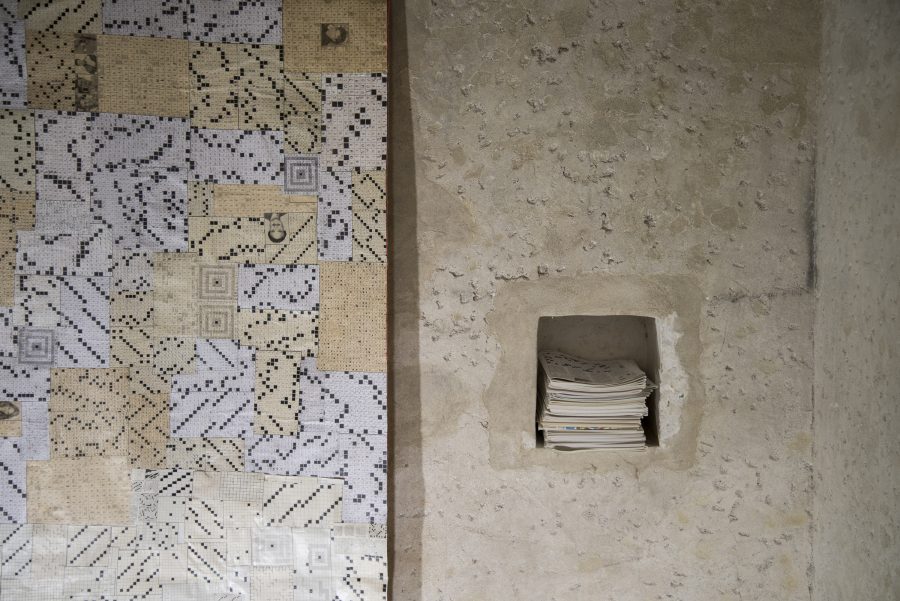 Installazione: Spazio Sacro verbum, dimensioni totali 5x 4 m (in 3 pezzi)- collage di cruciverba compilati su tappeto.