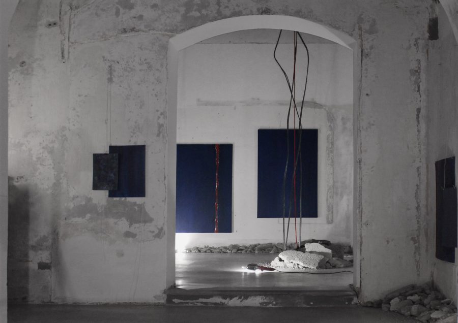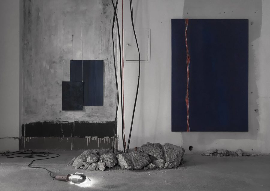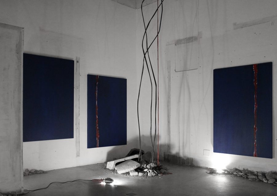 olio su tela, olio su carta, elementi tessili, ferro, macerie