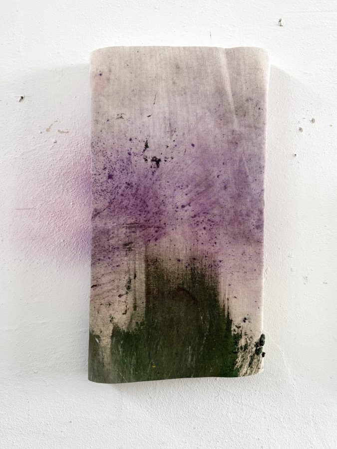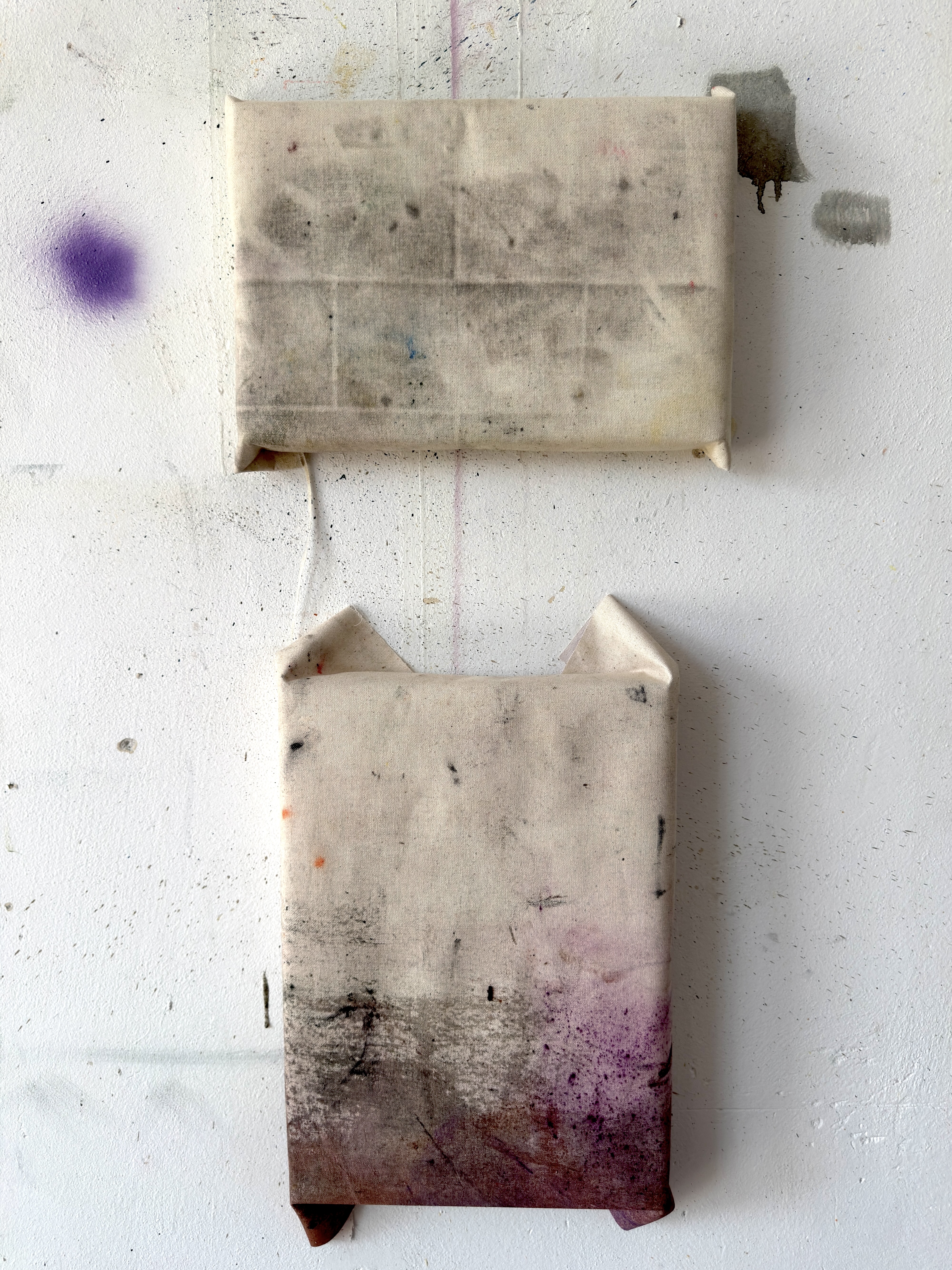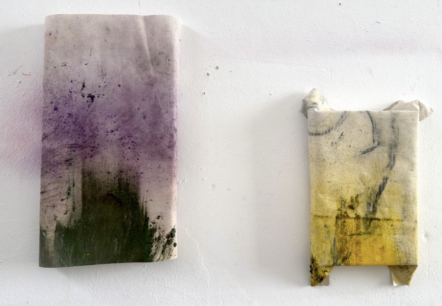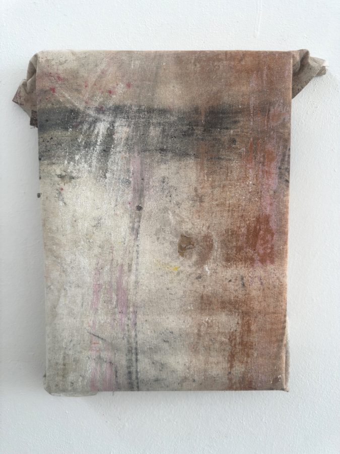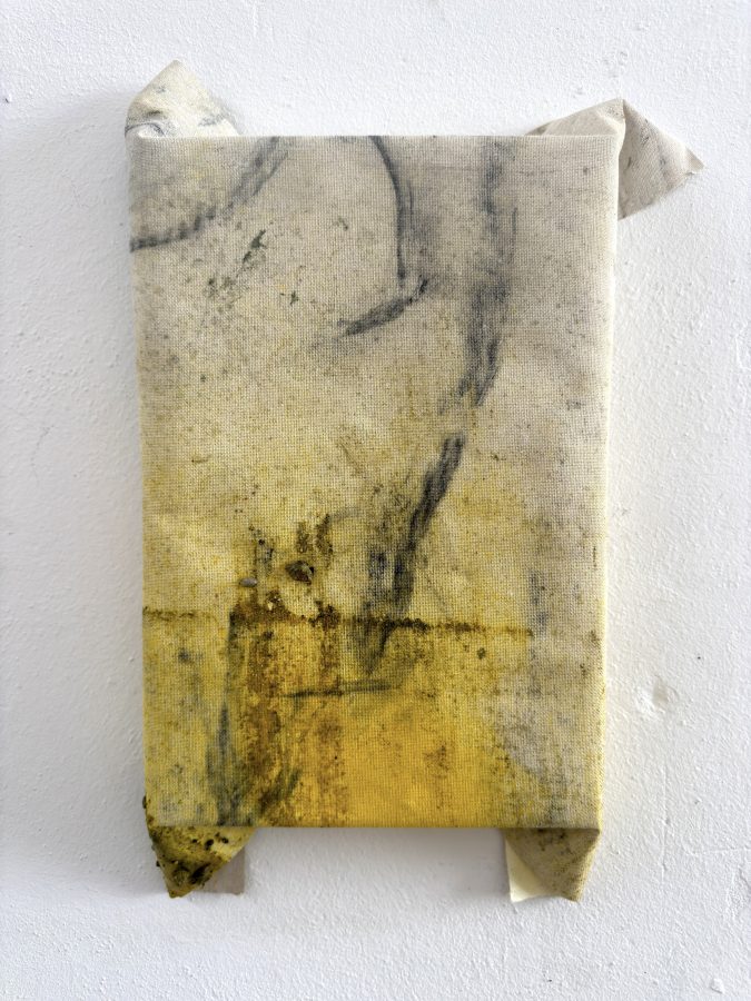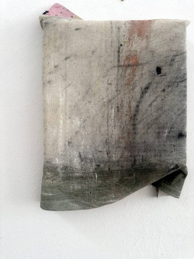 Pigmenti, carbone e ghiaia su cotone parzialmente intelaiato, dimensioni variabili