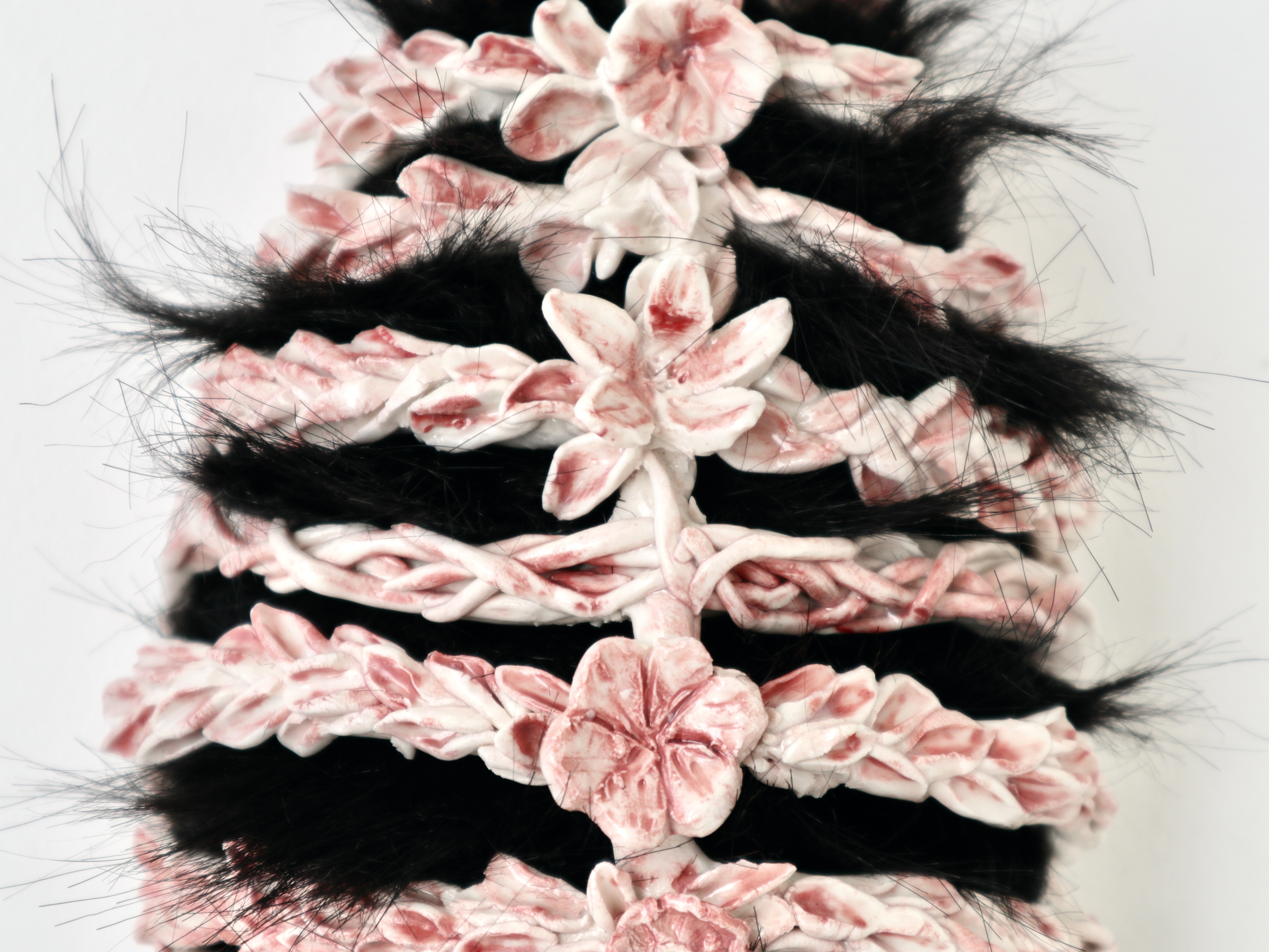 Porcellana, ingobbio, cristallina, poliestere, nylon, peliccia, rami di rosa, vino, make-up, filo di ferro, pelliccia sintetica