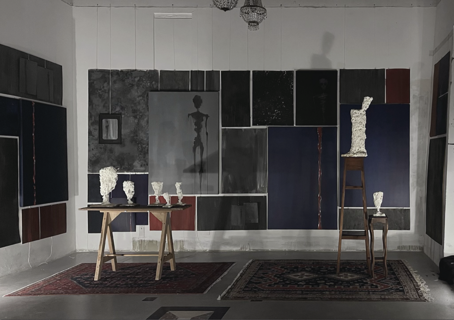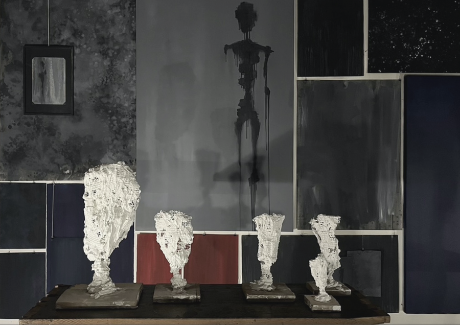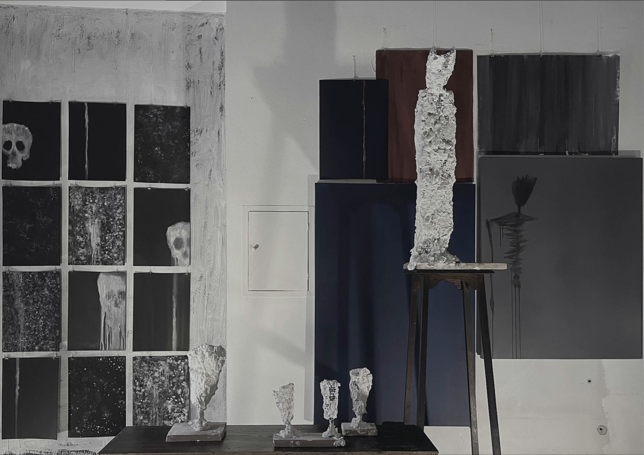 olio su tela, olio su carta, legno, rete metallica, gesso
