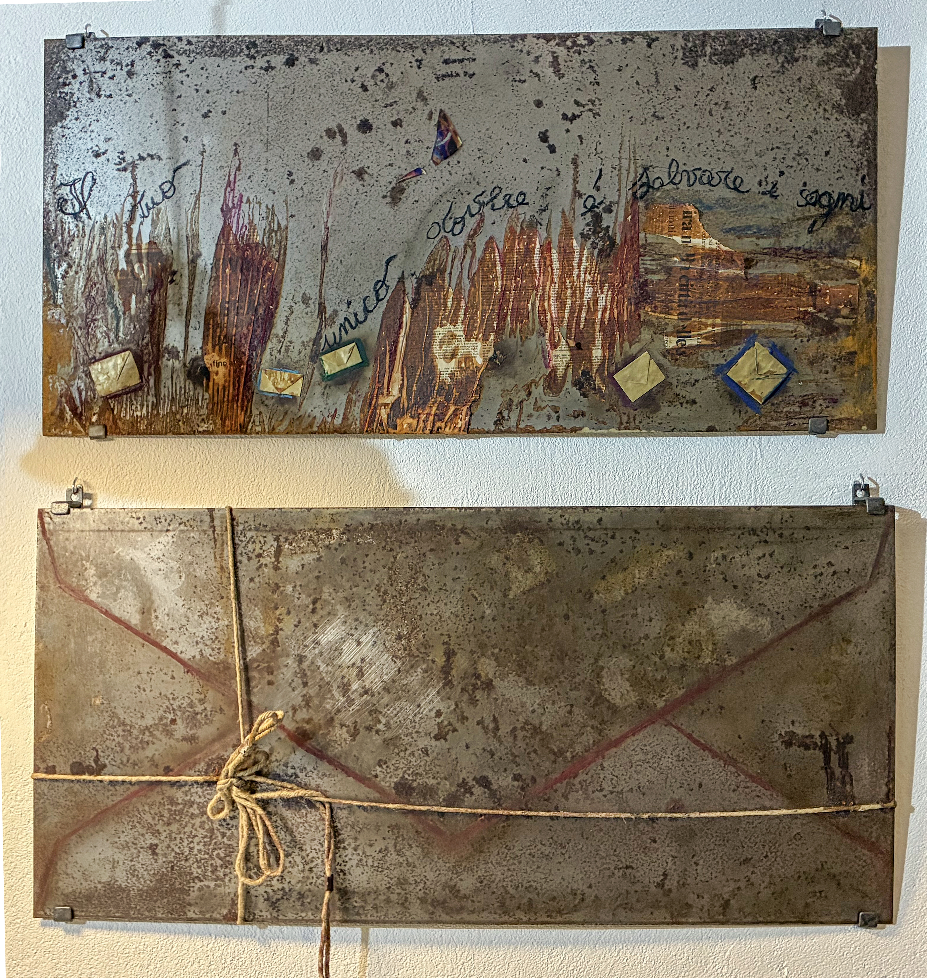 I “fogli” metallici assumono così la forma di lettere materializzate: segnate da pieghe, chiusure simboliche, corde e timbri che evocano spedizioni lontane. Messaggi senza destinatario preciso, inviati all’umanità e, insieme, rimandati al mittente. Ogni elemento diventa frammento narrativo in cui le immagini, generate dalla ruggine e dalla polvere, si aggregano in figure evocative, suggerendo un racconto sospeso tra volontà e realtà.