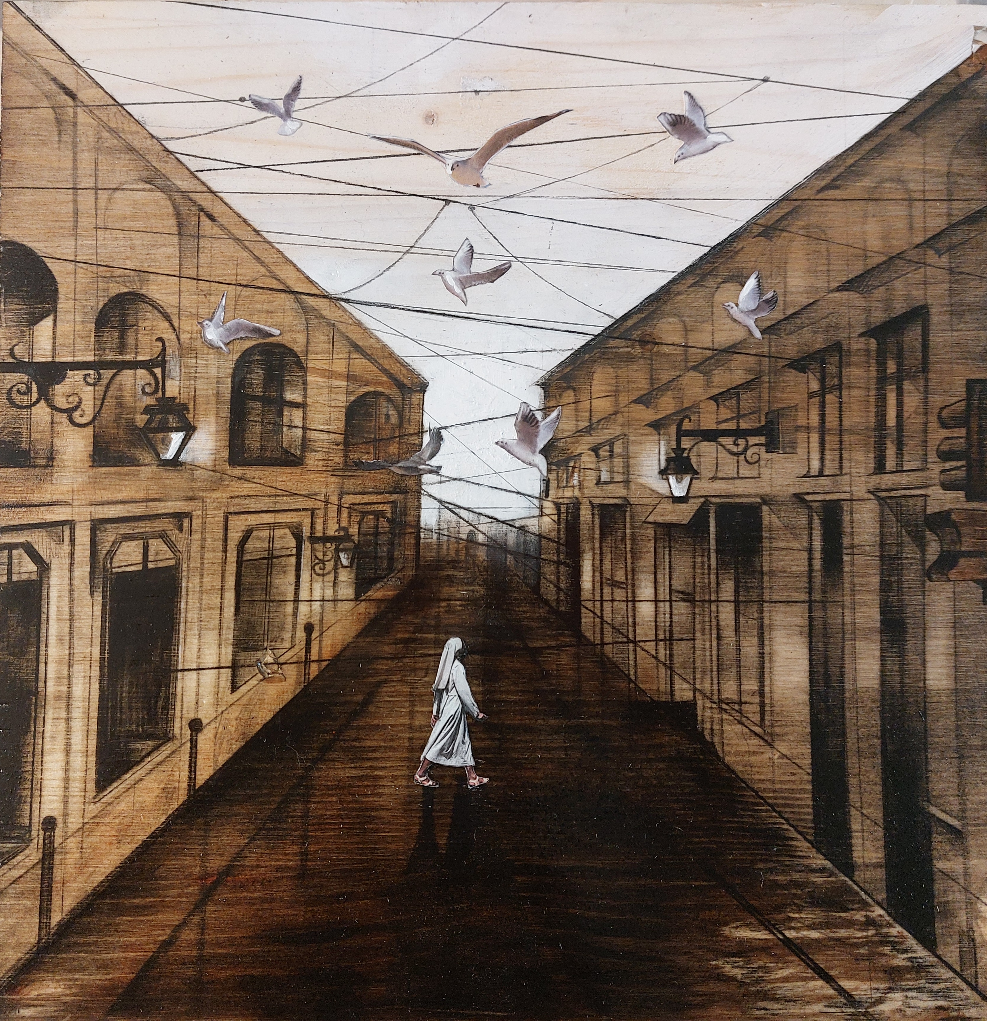 Panel, mixed media (bitumen, wax, pastel, graphite, chalk, acrylic, oil, paper), unique piece, ''Houses and Houses'' series.