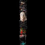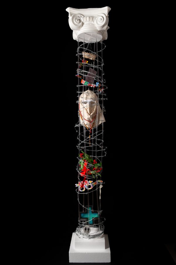 La colonna, costruita in filo spinato, assume la forma di un corpo architettonico ferito. Il materiale, storicamente legato alla separazione e al controllo, diventa la rappresentazione dei confini che l’umanità ha continuamente edificato: limiti mentali, culturali e sociali che definiscono la nostra identità.