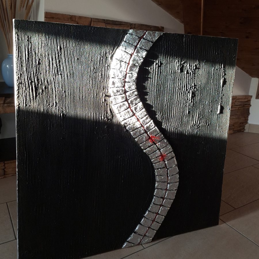 Opera su tela - La superficie della cerniera costruita nel contrasto tra il fondo nero gomma e la linea argentea, evoca la materia urbana come ritmo e memoria del movimento. Il nero assorbe la luce, come i pavimenti delle stazioni metropolitane, mentre l’argento la restituisce in un lampo, come un convoglio che sfreccia, tagliando lo spazio.Il filo rosso, che si spezza e si incastra lungo il percorso, introduce una tensione visiva. L’opera diventa così una geografia di contrasti — pieno e vuoto, opaco e lucente, materia e flusso. Nel silenzio del nero e nella vibrazione metallica dell’argento, Urban Zip #2 trova la propria misura: un frammento di città, una pausa nel suo incessante movimento.