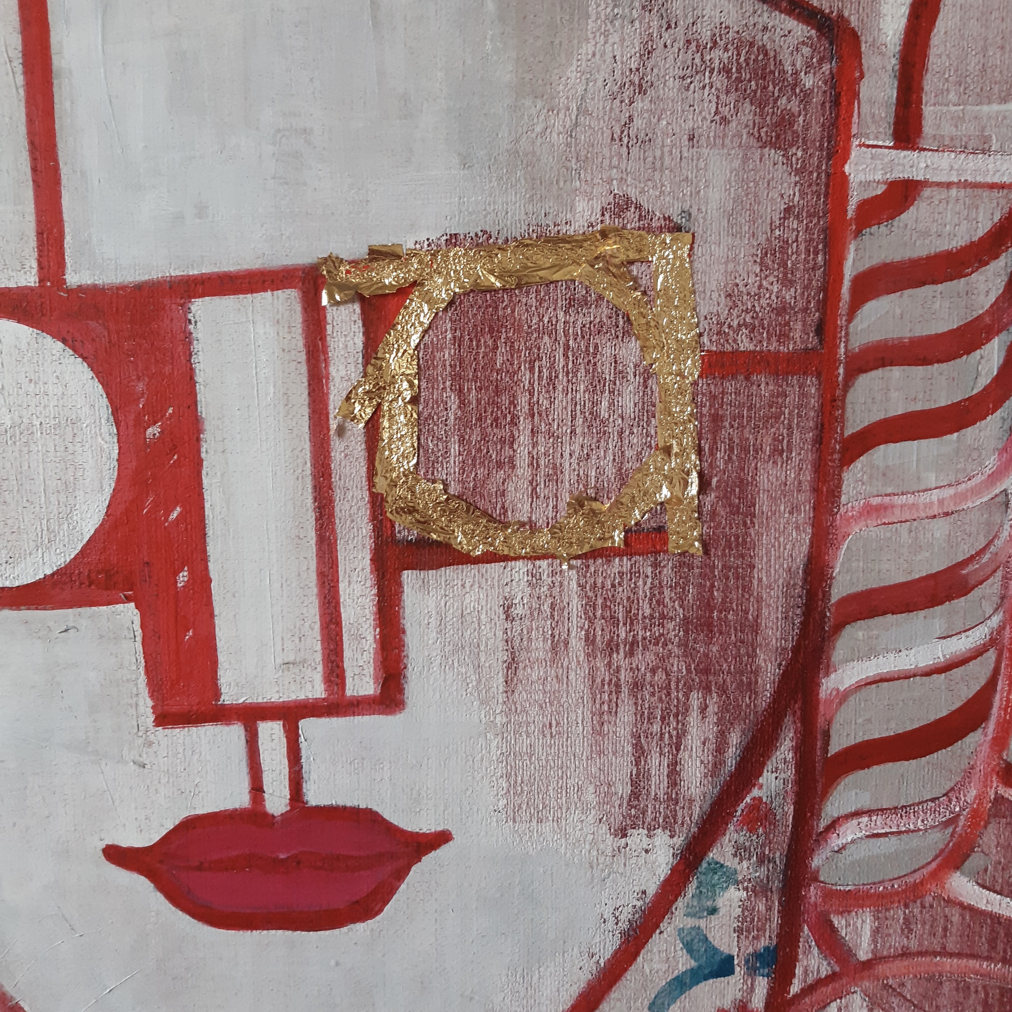 Enigmatici volti femminili dai collari maiolicati e le capigliature di ferro battuto compongono la serie “Pop Vestalis” in cui reinterpreto il tema della donna angelo del focolare, consacrato e devoto per sua stessa natura al “prendersi cura” tuttavia ardente di quel puro istinto di libertà. Tecnica mista su tela, foglia oro e piume di struzzo.
