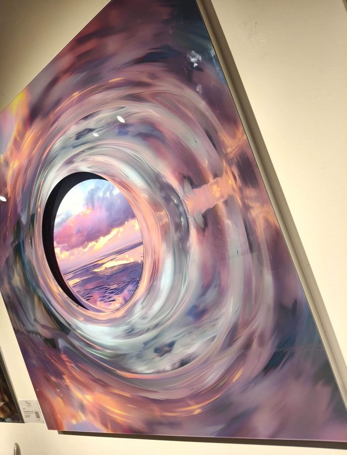 Attraverso un QR code integrato, il lavoro si espande in una dimensione dinamica. Il video generativo consente allo spettatore di entrare letteralmente dentro il vortice: chi guarda si ritrova immerso in questa isola immaginaria, diventando partecipe dell’isolamento voluto dei due amanti. Non come osservatore esterno, ma come presenza interna al sogno.