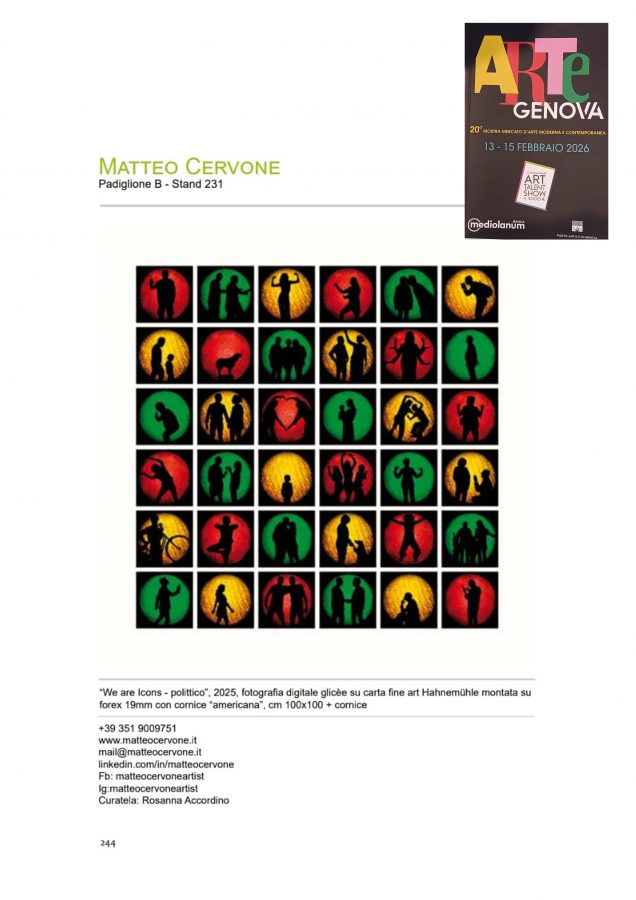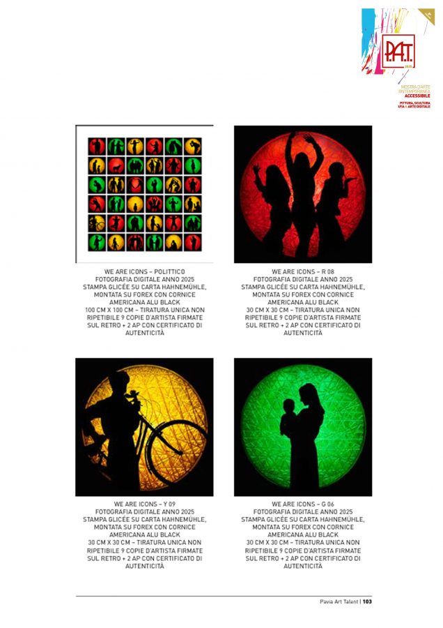 “We Are Icons - Polittico” é stato pubblicato nei seguenti media: Pavia Art Talent 8° catalogo onpaper Novembre 2025; ArteGenova 20° catalogo onpaper Febbraio 2026; La Semaforica Srl monografia Signal Art & Design onpaper Marzo 2026
